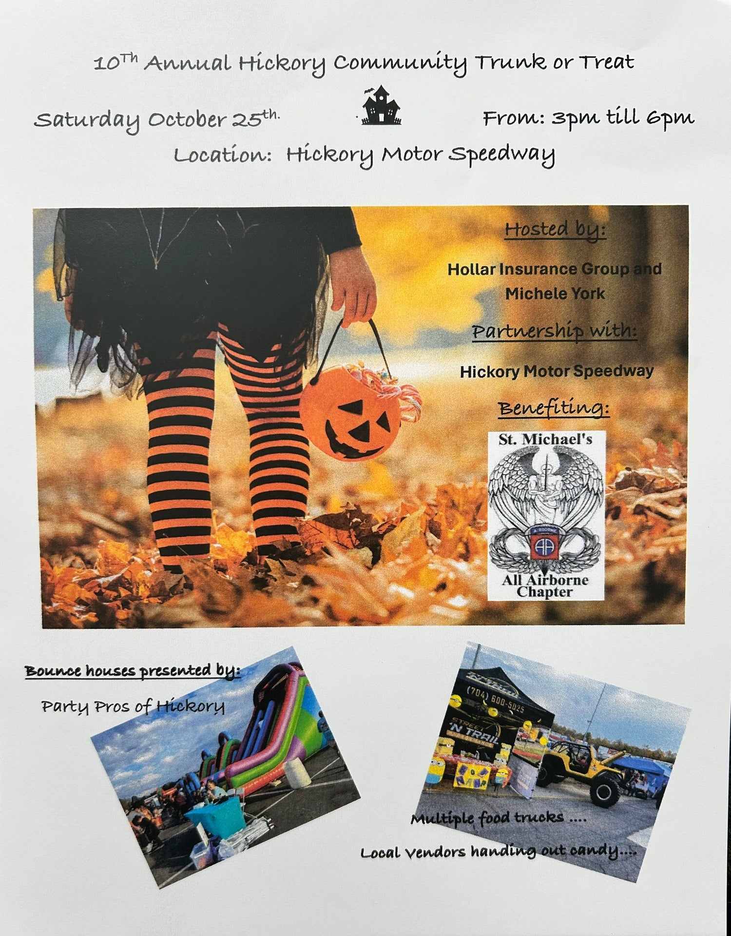 Join us at the Hickory Motor Speedway for the annual Trunk Or Treat, where proceeds will benefit the WNC St. Michael All Airborne Chapter of the 82nd Airborne Division for Veterans. Lots of fun and candy for kids of all ages!